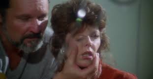 Scenen fortsetter sitt seige tempo og det gjør alt mye mer intenst. Skuespilleren virker å handle i sirup, når hun først reagerer og prøver å flykte. Først det vettskremte utrykket når hun ser morderen komme. Så sjokk og vantro i skjønn forening. Skikkelsen rekker å komme helt innpå. Sigden hogger løs.
