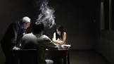 Utrykket til en mann som må se på at kjæresten blir gruppevoldtatt av autoriteten, uten å kunne gjøre noe som helst annet enn å henge som slakt fra den ene armen, lenket fast i taket med håndjern. Det svarte blikket hans, som paradoksalt nok lyser av sinne, får det til å sitre i meg.
